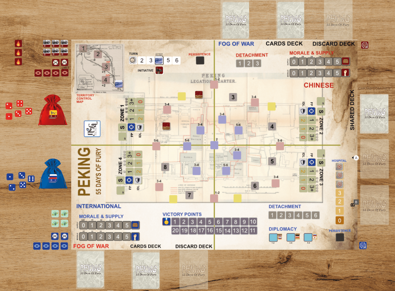 Each turn represents roughly 11 days of the siege. The game board depicts the International Legations, divided into four main areas. Players use a combination of event cards and operation points to execute actions, such as firefights, raids, artillery attacks, and barricade repairs.